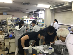 5月22日、久留米大学法医学教室を見学させていただきました。研究室はとても広く開放的だったのが印象に残っています。久留米大学では血液型の遺伝子をはじめとした遺伝子多型の研究がさかんで、今回は主にABO式血液型検査の実習をしました。