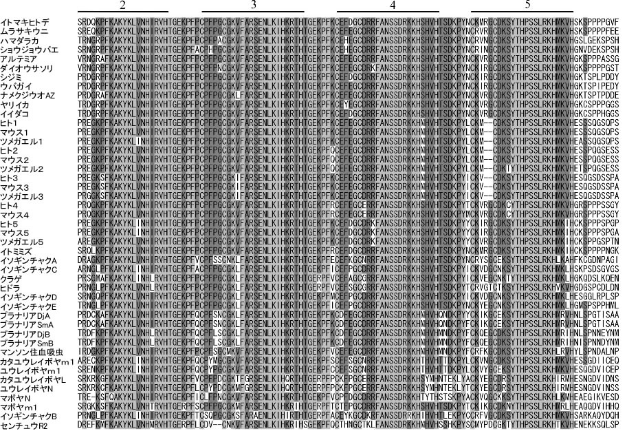 比較の対象としたのは、多くの動物の発生過程で働くことが知られているZic遺伝子とMsx遺伝子です。これらの遺伝子は、動物の体づくりに広く使われる工具のようなものであり、「ツールキット(tool kit)遺伝子」と呼ばれています。多くの場合、ツールキット遺伝子は他の遺伝子の働きをオン・オフにするスイッチとして働くタンパク質や、細胞内・細胞間の情報のやりとりをするタンパク質を作ります。Zic遺伝子とMsx遺伝子は前者のひとつであり、DNAに働きかけるタンパク質をつくっています。下図に遺伝子にコードされているタンパク質の構造(アルファベットはタンパク質を構成するアミノ酸の並び順を表しています)をさまざまな動物で比較した例を示してあります。薄い灰色のところは全ての動物で一致しているところ、濃い灰色のところは比較的多くの動物で保存されているところを示しています。