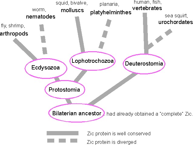 The selective loss (or degeneration) of the conserved domains seems to be a common tendency of evolutionary processes of Zic and Msx genes. The feature may be explained by the differential evolutionary speed among the animal groups, or by the difference of the body organization (i.e. the difference between simple and complex body organizations. The constraint on the protein structure may have become strong if the tool-kit proteins mediate many, essential developmental processes.). Focus of our study is moving onto how the structural differences of the tool-kit-proteins generates the functional diversity, which, in turn, could be involved in the diversity of nervous systems in currently living animals. |