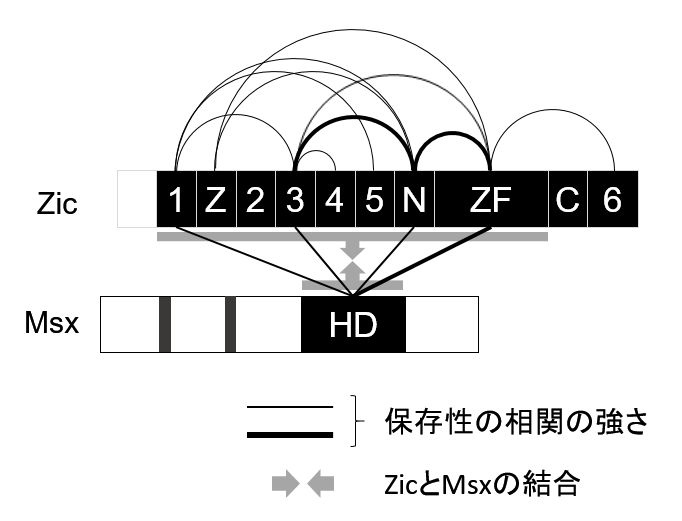 一方、Zicタンパク質の中のいくつかの保存ドメインの保存の程度とMsxのホメオドメイン(DNAやタンパク質との結合に関わるドメイン)の保存の程度が強く相関していることがわかりました。また、実際にZicタンパク質とMsxタンパク質を用いた実験を行い、結合することをさまざまな動物由来のZicタンパク質とMsxタンパク質で見いだすことができました(下図)。